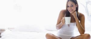 Woman sitting on bed drinking coffee smiling